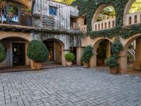 the courtyard with several potted plants and a wall full of green plants and arched arches