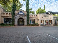 In the heart of downtown Sedona, Arizona, a bustling shopping area awaits. Historic architecture and urban design blend seamlessly, creating a vibrant atmosphere. The courtyard boasts a parking garage and shop fronts on the other side of the walkway.