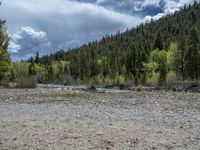 Open space in Colorado, USA, with a scenic river cutting through the landscape. Daytime clouds float above the rocky riverbank and gravel areas. Nature's beauty captured in this serene Colorado river landscape.