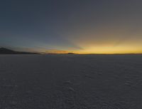 the sun rising over the vast plain behind mountains in the distance, with footprints left of the vehicle