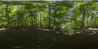 the forest is filled with leafy trees and a dirt mound with a red fire hydrant