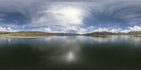 a lake that is very calm with no water in it, and a bright sun shines brightly through the cloud