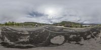 Open space in Colorado with a straight road leading to a picturesque lake. Clouds dot the clear blue sky on this beautiful day. Nature and landscape blend harmoniously in this serene park.