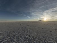 A serene dawn over the Utah desert landscape with mountains in the background. The sunlight casts a warm glow on the sand, creating a beautiful atmosphere. Clear blue skies and contrails add to the natural beauty of this sunny day.