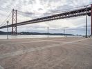 A serene view of an intersection in Lisbon, Portugal. The bridge on the opposite bank connects the city to an open space. The calm lake reflects the gloomy grey sky, creating a peaceful and gloomy atmosphere.