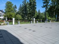 This stock photo captures the shadow of a person sitting on a concrete ground next to a white building and some trees in Berlin, Germany. The clear sky and open space surrounding the classic architecture create a serene atmosphere. The image showcases a charging station or recharging unit, highlighting the advancements in electric technology. The parking lot surface provides a practical space for visitors to charge their vehicles at this base station in Europe.