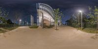 A modern high-rise apartment building in the heart of Shanghai's business district. The monochrome cityscape is illuminated by artificial light, casting shadows on the concrete and glass structures. The view from a park bench reveals a symmetrical parking lot, adding to the urban design.