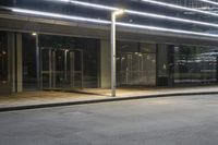 a street light in a building near an empty sidewalk at night time the lights are shining bright