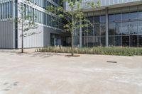 Modern architecture in the heart of Shanghai's business district. The sleek office building is surrounded by a concrete courtyard and lush green grass. A symbol of urban design and city life in China.