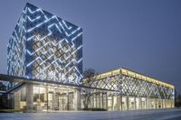 A sleek and modern corporate headquarters in China's bustling city of Shanghai. The building is illuminated with vibrant lights, while the surrounding structures feature unique triangular-shaped glass windows. A striking image of urban architecture at night.