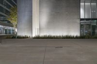a cement wall that has some plants on it and lights around the perimeter and buildings