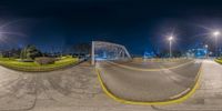 A fish-eye lens captures the unique architecture of a pedestrian crossing bridge in Shanghai, China. The blue sky provides a striking backdrop to the cityscape. Artificial lights illuminate the urban thoroughfare at night.