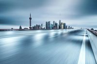a city skyline in motion with a very long exposure effect, taken by a camera