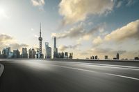 This image showcases the cityscape of Shanghai, China at dawn. In the foreground, a road with motion blur leads into the modern architecture of the city. The asphalt road is icy, reflecting the cold weather. The urban scene is illuminated by street lights and artificial light, creating a vibrant atmosphere. The skyline of Shanghai, with its iconic buildings and bridges, forms the backdrop. The image provides an overview of the bustling municipality of Shanghai, representing the dynamic and cosmopolitan nature of Asia's largest city.