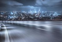A car drives through the streets of Shanghai at night, with the city skyline illuminated by artificial light. The motion blur adds a sense of movement to the image, capturing the energy of the bustling metropolis.