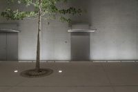 A modern concrete building in the heart of Shanghai's business district. The sleek urban design features composite materials and artificial lighting. A tree inside the building adds a touch of nature to the urban landscape.