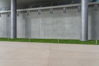 A modern architectural marvel in the heart of Shanghai's bustling business district. This office building features a tall grey wall with black poles, surrounded by meticulously designed urban infrastructure. Grass grows along the walkway, creating a peaceful contrast to the vibrant city life.