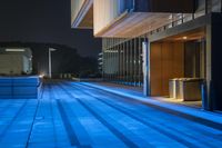 the city's sidewalks are lit by blue lights from buildings on either side of the walkway