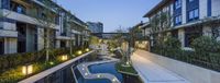 Aerial view of a modern residential complex in Shanghai, China at dawn. The mixed-use property features multiple apartment buildings, a swimming pool, and a courtyard. Clear skies and artificial light highlight the architectural beauty.