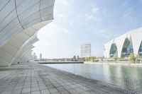 A stunning view of Shanghai's modern architecture against a clear blue sky backdrop. The white buildings line the shore of a shimmering lake. The vibrant cityscape showcases the metropolis of Shanghai, a bustling urban center in Asia.