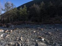 a herd of sheep walking along a rocky riverbed between trees and rocks in a mountainside area