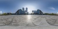 A modern architectural marvel in Shenzhen, Guangdong, China. The futuristic design of the building stands out against the clear sky. The open plaza features a unique circle and square pattern. A sunny day casts hard shadows on the glass and metal walls.