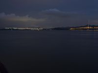 A breathtaking night view of Shenzhen's city skyline, reflected on the calm waters of the ocean. Dark clouds create a dramatic atmosphere, contrasting with the artificial light illuminating the city. Explore the enchanting coastal city of Shenzhen, Guangdong.
