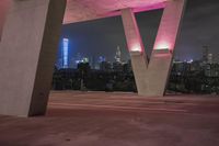 A stunning night view of Shenzhen, China, showcasing the modern architecture of the city. The pink light on the roof and traffic sign add a unique touch to the metropolitan area. A clear sky illuminates the cityscape.