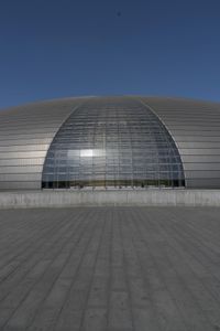 This stunning stock photo showcases a futuristic dome in Beijing, China. The dome is incredibly shiny, reflecting the surrounding cityscape. On one side, there is a glass facade revealing the interior of the structure. The architecture is truly unique, displaying a blend of modernity and traditional elements. The dome stands out against the urban landscape, providing a splendid contrast. The photo captures the bright daylight, emphasizing the dome's futuristic design. The road surface and asphalt in the foreground add depth to the composition. Wood flooring can be seen through the glass, adding warmth to the space. The dome's profile is defined by sleek lines and a prominent arch, creating a sense of grandeur. This remarkable stock photo is perfect for illustrating futuristic architecture, urban environments, and the vibrant city of Beijing in Asia.