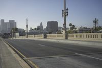 The iconic Sixth Street Bridge in Los Angeles, California, with its stunning architecture and skyline. The clear dawn sky reflects off the Armco barrier, creating a captivating cityscape. A bustling urban scene on a beautiful day.