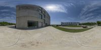 A skateboarder glides down a sloping skate park area near a modern office building in Spain. The clear sky and open space highlight the striking architecture and urban landscape. The person's profile creates a dynamic silhouette against the concrete wall and hard shadows.