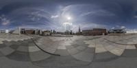 A fisheye view of a skate park in Berlin, Germany. The modern architecture of the high-rise buildings contrasts with the clear sky. The urban design features open spaces and symmetrical facades. A vibrant cityscape at dawn.