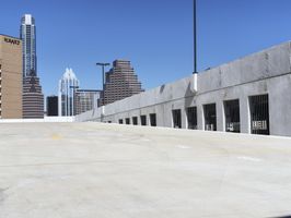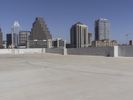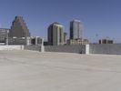 A skate park in downtown Los Angeles, California, with a backdrop of high-rise buildings and a clear blue sky. The urban cityscape showcases the metropolitan area's architectural diversity.