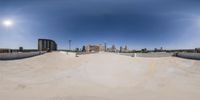 this skate park is full of ramps on the ground with buildings in the background and blue skies above