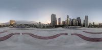 A skate park in Los Angeles with high-rise buildings in the background. Futuristic architecture combines with urban design to create a dynamic cityscape. Clear skies and a bustling business district make for a perfect day in the city.