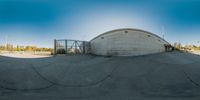 A man skateboarding on the edge of a skate park in North York, Toronto. The circular view captures the architectural beauty of the city. Sunlight casts hard shadows on the concrete walls and asphalt road surface.