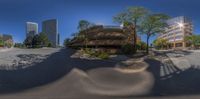 fisheye lens on a skate park, with multiple buildings in the background in the day time