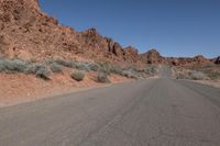 A man rides his skateboard down a narrow desert road in the Nevada mountains. The low desert landscape contrasts with the clear sky and red rock formations. Experience the natural beauty of the American Southwest.