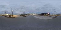 skateboarding at a skateboard park with a snow bank and lights in the background