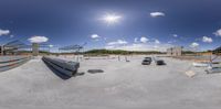 a wide angle view of the skateboard park area with many ramps and skateboards on the ground