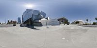 A fisheye view of a mostly empty skateboard park in downtown Los Angeles. The futuristic architecture and monochromatic design create a calm and serene atmosphere. Clear skies and sunlight reflect off the concrete and steel structures.