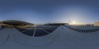 A skateboard park at sunset, captured in 3D reality form with the camera pointed down. The park's architecture is highlighted by the warm sunlight, creating a serene atmosphere. The park is surrounded by trees and vegetation, with a lake in the background.