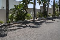 Skateboarder glides down an asphalt road in Los Angeles, surrounded by modern residential architecture. Palm trees provide a California touch to the scene under a clear sky. A perfect day in the Hollywood Hills.