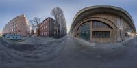 A skateboarder rides on a half-pipe in Berlin, Germany. The fisheye effect adds an artistic touch to the classic architecture and multicolored buildings. The urban atmosphere and winter scenery create a unique backdrop.