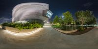 Skateboarder performing tricks on the concrete surface of a city park at night. The modern architecture of surrounding buildings creates a stunning urban landscape. The clear night sky provides the perfect backdrop for this impressive display of skill.