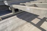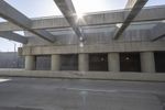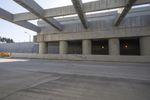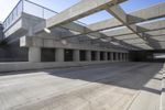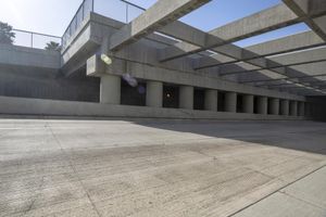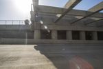 A skateboarder attempts tricks on a concrete ramp in California. The modern architecture of the underpass complements the urban landscape. The clear sky and sunshine create a vibrant backdrop for the skater's performance.