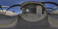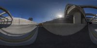 the skateboarder is attempting tricks on the concrete surface of the ramp, viewed through fish eye lens