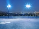 Skateboarder carving a half pipe in Los Angeles at night. The city skyline serves as a backdrop, illuminated by artificial lights. Concrete ramps and barriers create an urban playground.