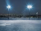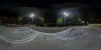 a skateboarder on a half pipe on some concrete at night, with lights