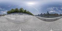Upside down view of a skateboarder jumping on a ramp in downtown New York City. Clear sky and skyscrapers create a stunning cityscape. The reflection of the city on the surface adds to the urban vibe.